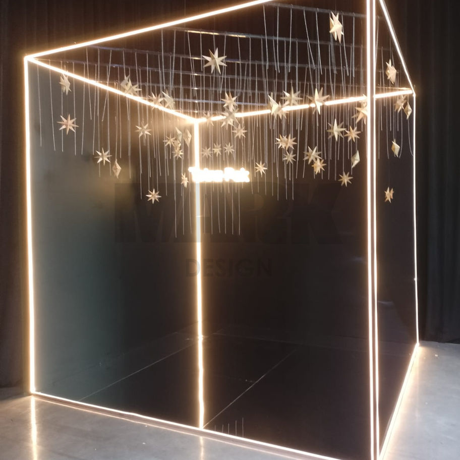 Estructura de caños de hierro con piso de MDF y placa espejo + lonas tensadas y ploteadas con vinilo negro mate. Consultar objetos agregados como cadenas, estrellas de papel y cartel neón.MEDIDAS: 3mts x 3mts x 3mts. Estructura desmontable.